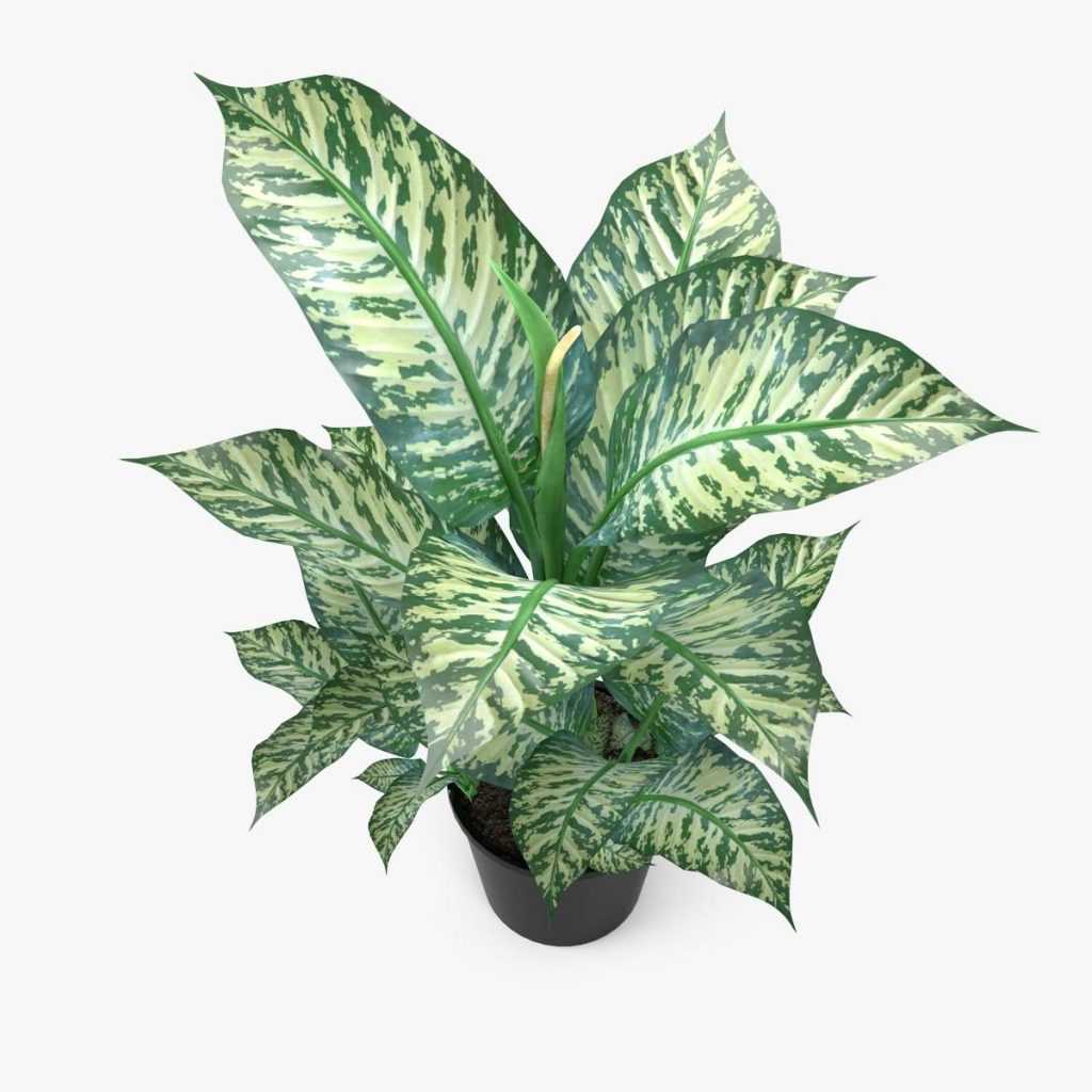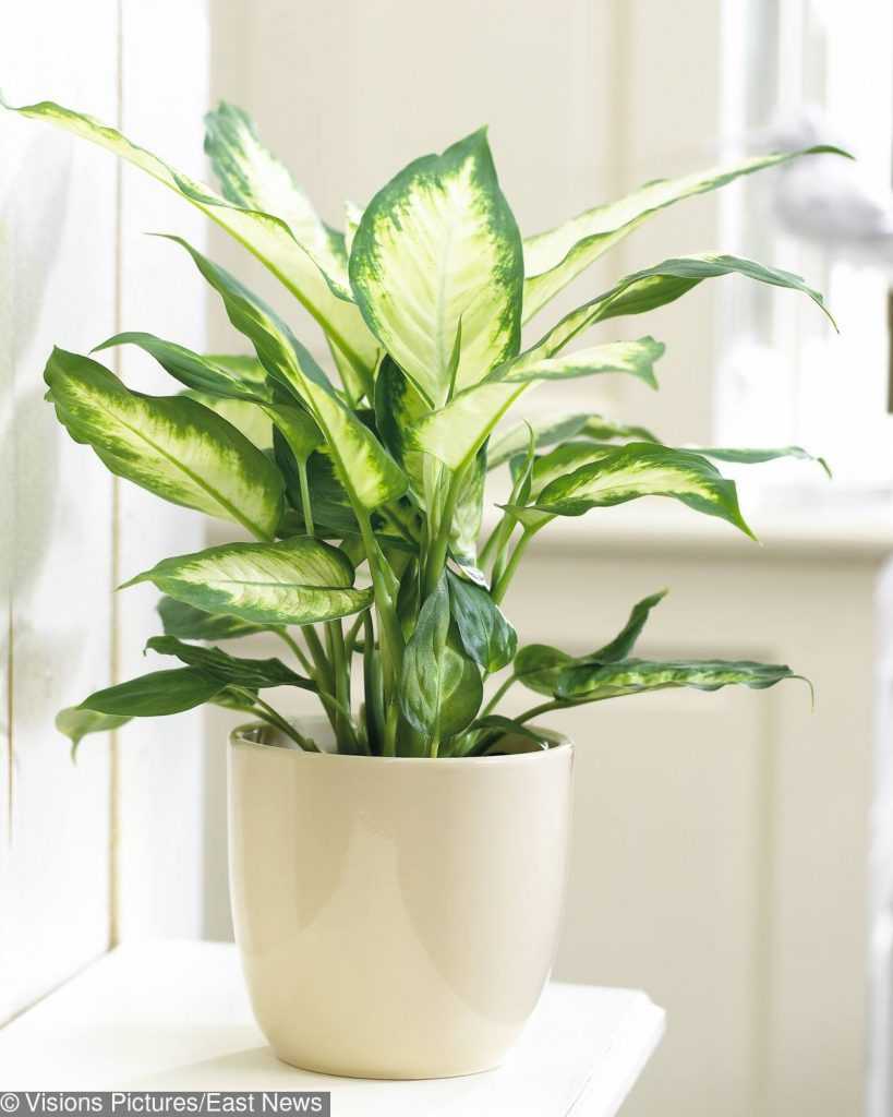 - Диффенбахия. Данное растение часто используют для украшения офисов и квартир, так как оно выгодно вписывается в интерьер. Диффенбахия способна улучшать качество воздуха в помещении, где находится. Однако ставить его в комнате у детей не стоит. В его стеблях находится очень ядовитый сок, который может вызывать сильнейшее нарушение пищеварения. Если такой сок попадет на кожу, то возможно появление ожога. Поэтому ухаживая за растением, используйте защитные перчатки.