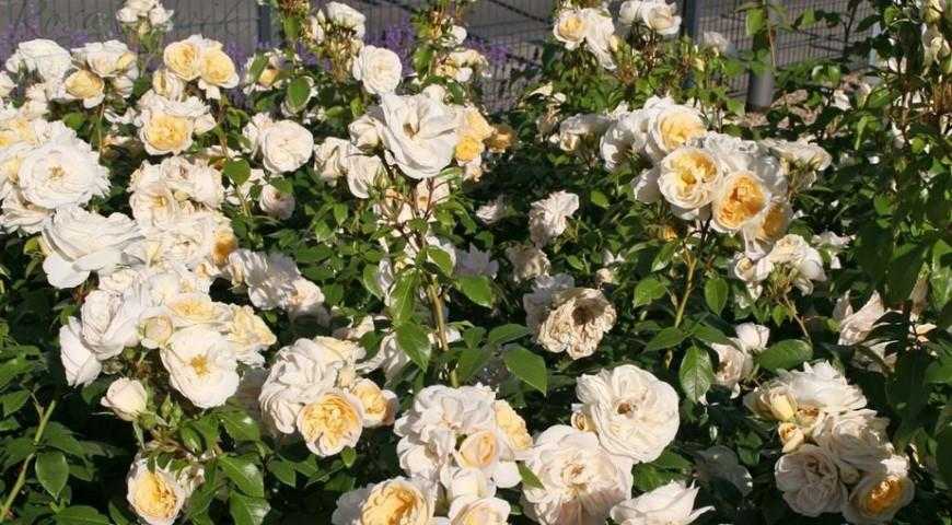 Бесшипный рамблер 400-500 см в высоту. Цветет умеренно, шапками не махровых белых цветов с желтыми тычинками.