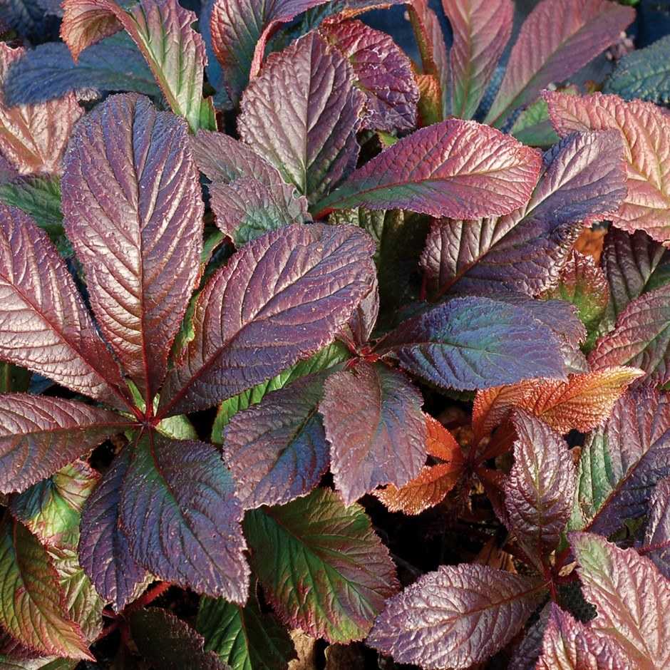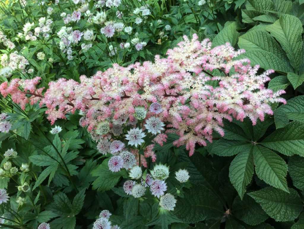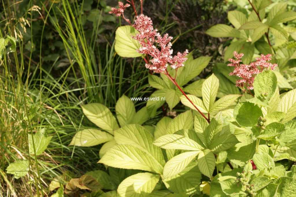 У астильбоидеса пластинчатого листья ажурные, зазубренные по краям. В высоту это растение достигает 1 м и хорошо растет в полутени, на влажной, богатой питательными веществами почве. Белые соцветия, также как и у дармеры щитовидной, возвышаются над крупными листьями.