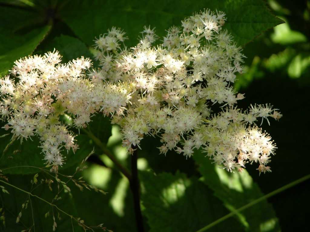 У него ажурные, пластинчатые листья с зазубринами по краям. Хорошо растет в полутени, на влажной хорошо удобренной питательными веществами почве. Куст в высоту растет до 1 метра. Пышные белые соцветия возвышаются над крупными листьями. Это растение, довольно, не прихотливо и морозостойко.