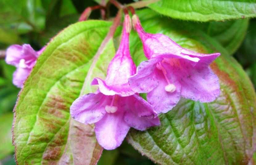 Вейгела приятная. Соцветия собраны в воронки розово-фиолетового цвета. Размер кустарника вейгелы 1,5 м x 1 м. Цветение длится с середины мая до начала июля, повторно цветёт в конце лета, начале осени.