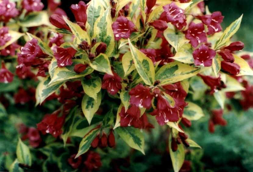 Вейгела ранняя Variegata. Этот кустарник не является ни высокорослым, ни низкорослым (взрослое растение достигает одного-двух метров в высоту). Листья имеют необычный окрас. На них присутствуют жёлтые пятнышки. Кремовые и розовые цветы просто завораживают. Обладательница удивительной красоты вейгела вариегата цветёт в мае.