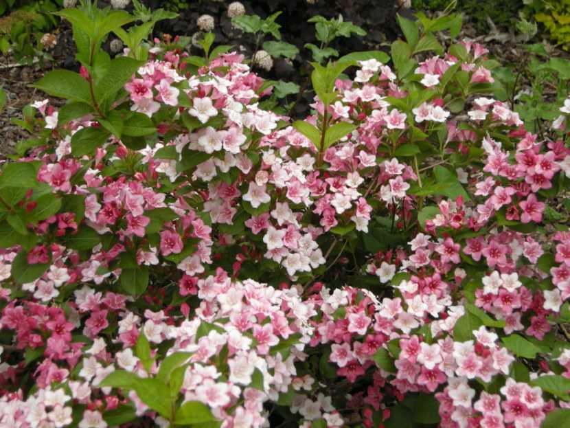 Вейгела ранняя. Родиной растения является Китай. Кустарники имеют высоту 2 м и красивую форму шара. Цветки либо одиночные, либо собраны по 2-3 штуки. Соцветия яркого розового цвета, а внутри карминово-красные. Цветёт в конце весны-начале лета.