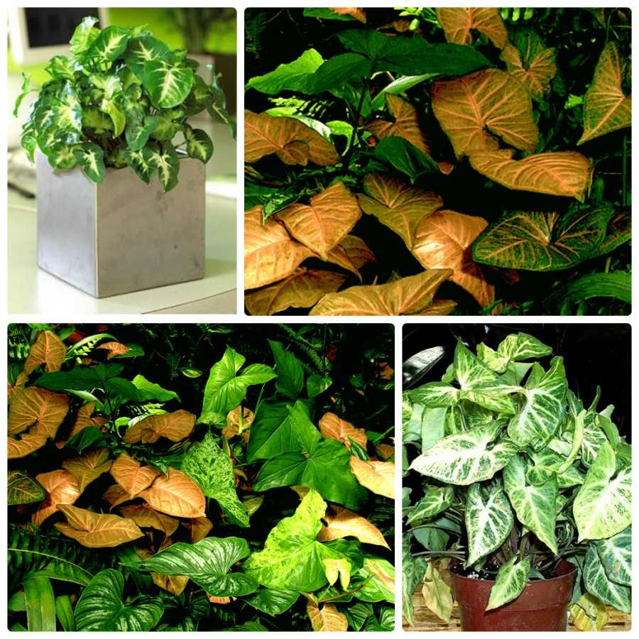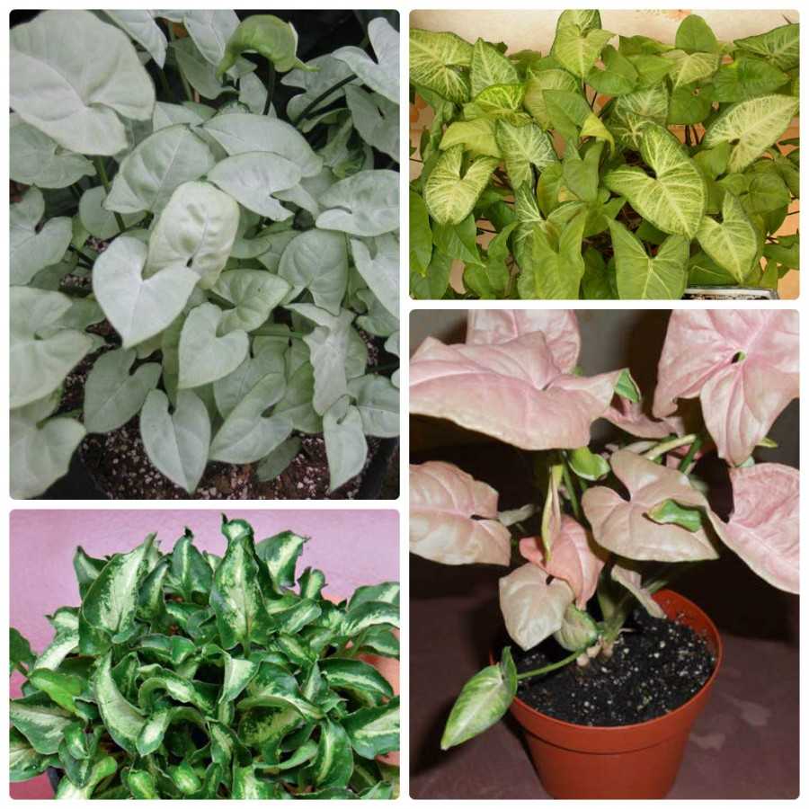 У видов этого растения много количество сортов. Цвет ее листьев от обычного зеленого до белого или пестрого окраса. Сначала листва сингониума растет стрельчатой, а поздней она превращается в широколопастную. Сингониум предпочитает частые поливы и опрыскивания, яркое освещение.